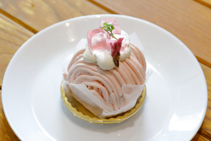 桜の香りをまとったあんクリームに、ダックワーズと苺のコンフィチュール、なめらかなクリームを重ねた春限定モンブラン。