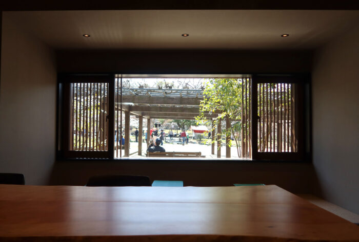 小さな居間のように空間が仕切られ、公園の景色が自然と目に入るつくりが印象的です。