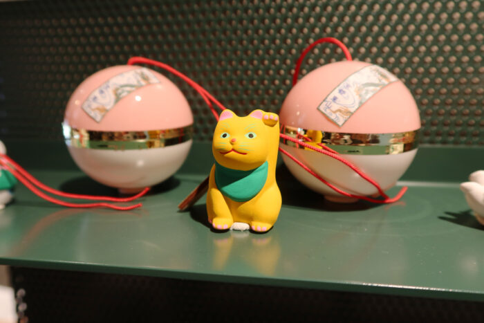 京都円山公園 菊の渓店限定の「縁起物チャーム 招き猫土鈴キク」も注目アイテム。※福玉カプセル内のチャームは何がでるかのお楽しみ