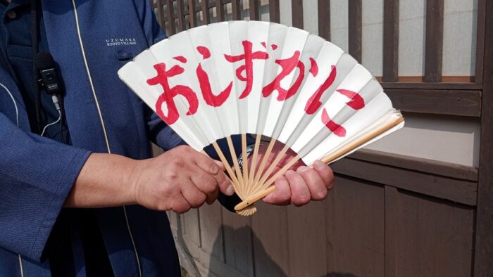 「本番!」の声がかかると観覧者に向けてスタッフが掲げる注意も扇子にて