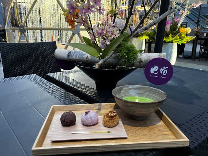 抹茶と三色おはぎのセットや、伏見の日本酒と京のおつまみなど、京都らしさを感じるラインナップを、美しい生け花とライトライトアップされた空間とともに楽しめます。