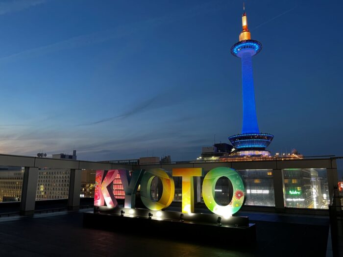 京都タワーを背景に「KYOTO」の文字が美しく映えます