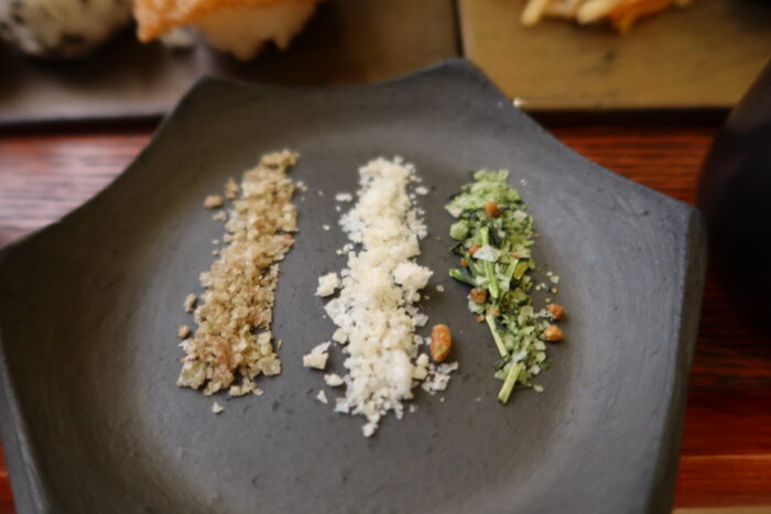 天ぷらには3種類の塩を合わせて。左から桜塩・柚子塩・玄米塩