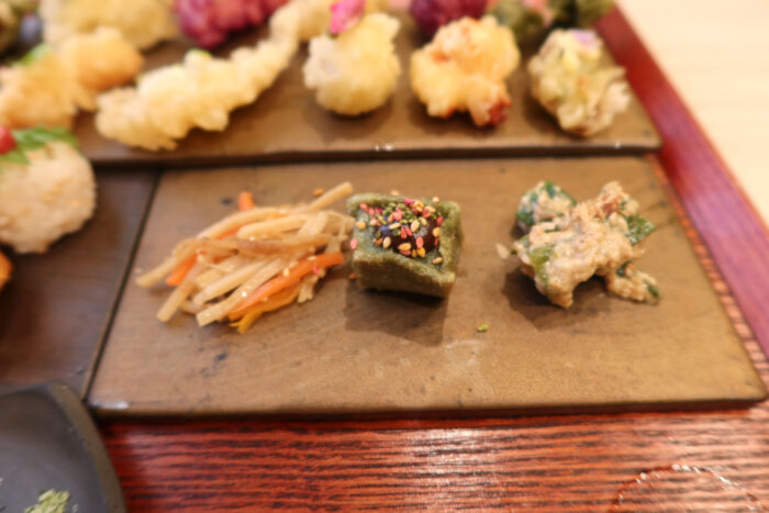 きんぴら・生麩の田楽・オクラの白和えの3種。